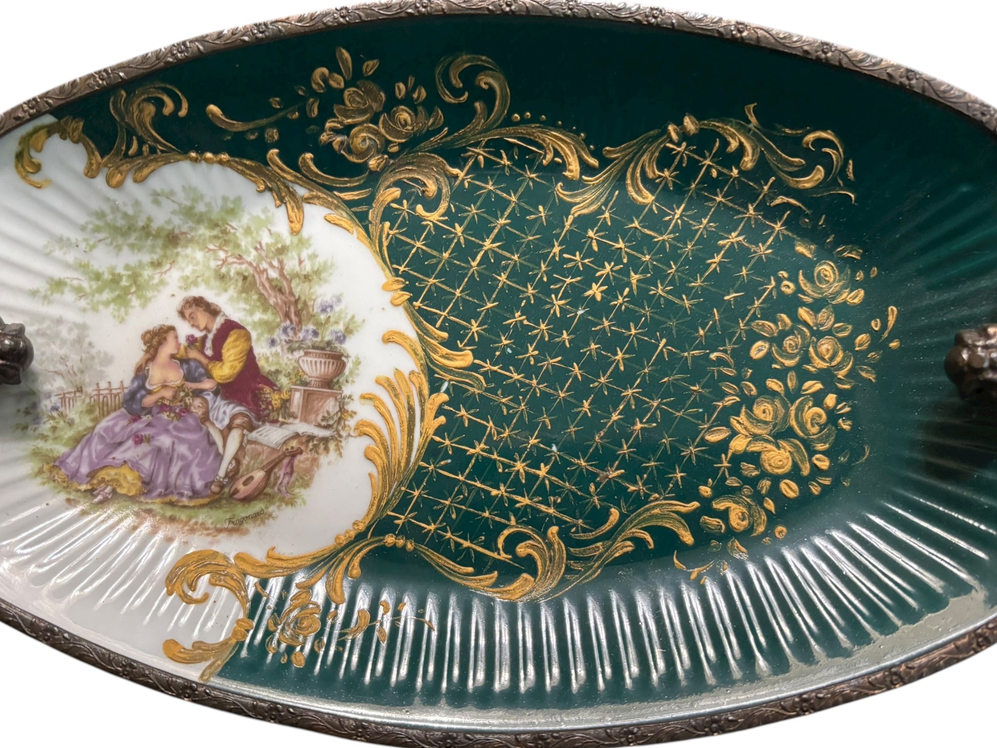 Antique Hand Painted Porcelana Petit Paris Industria Argentina Dish with Brass 13.75” long
