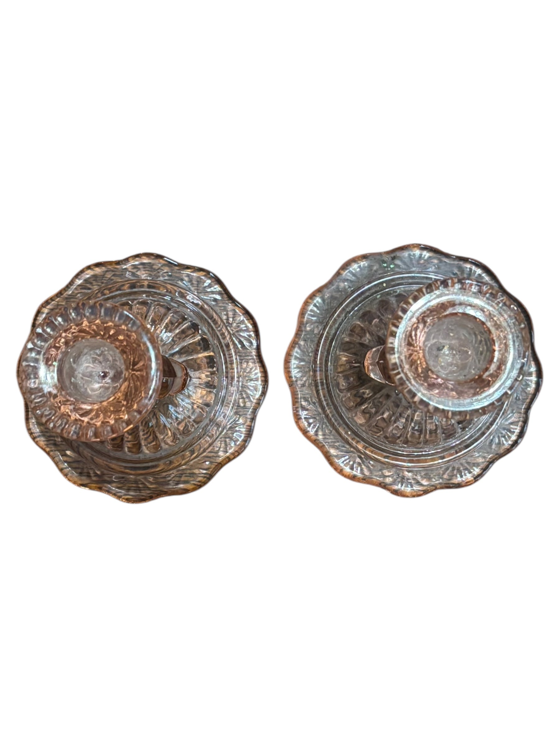 Set of 2 Flamingo Pink Heisey Dolphin Pressed Glass Candlesticks With Flared Petticoat Bottom 6” tall
