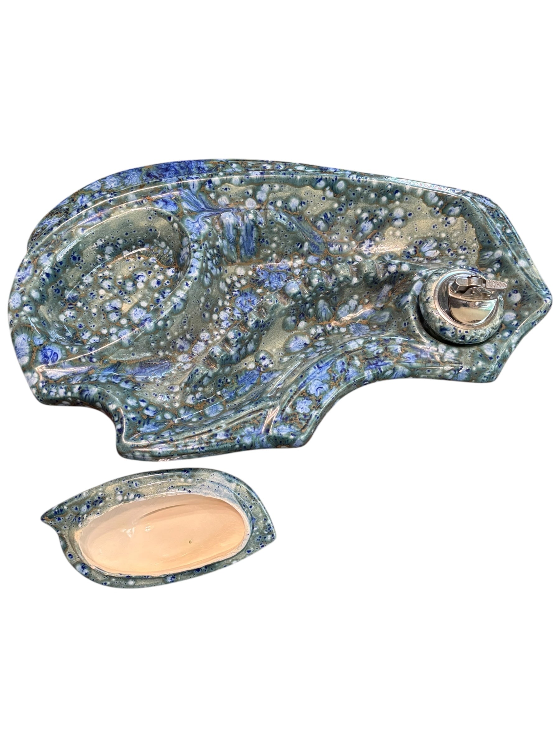Vintage MCM Large Ceramic Blue Speckled Ashtray 3pc W/ Lighter and Box